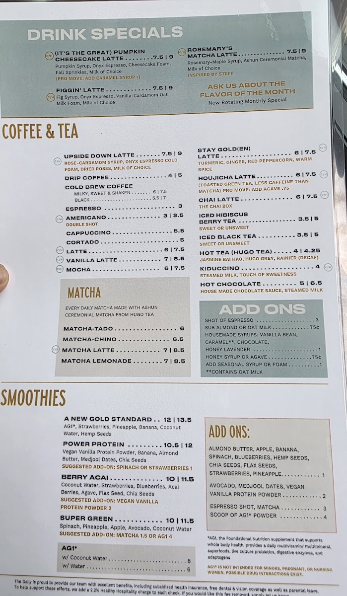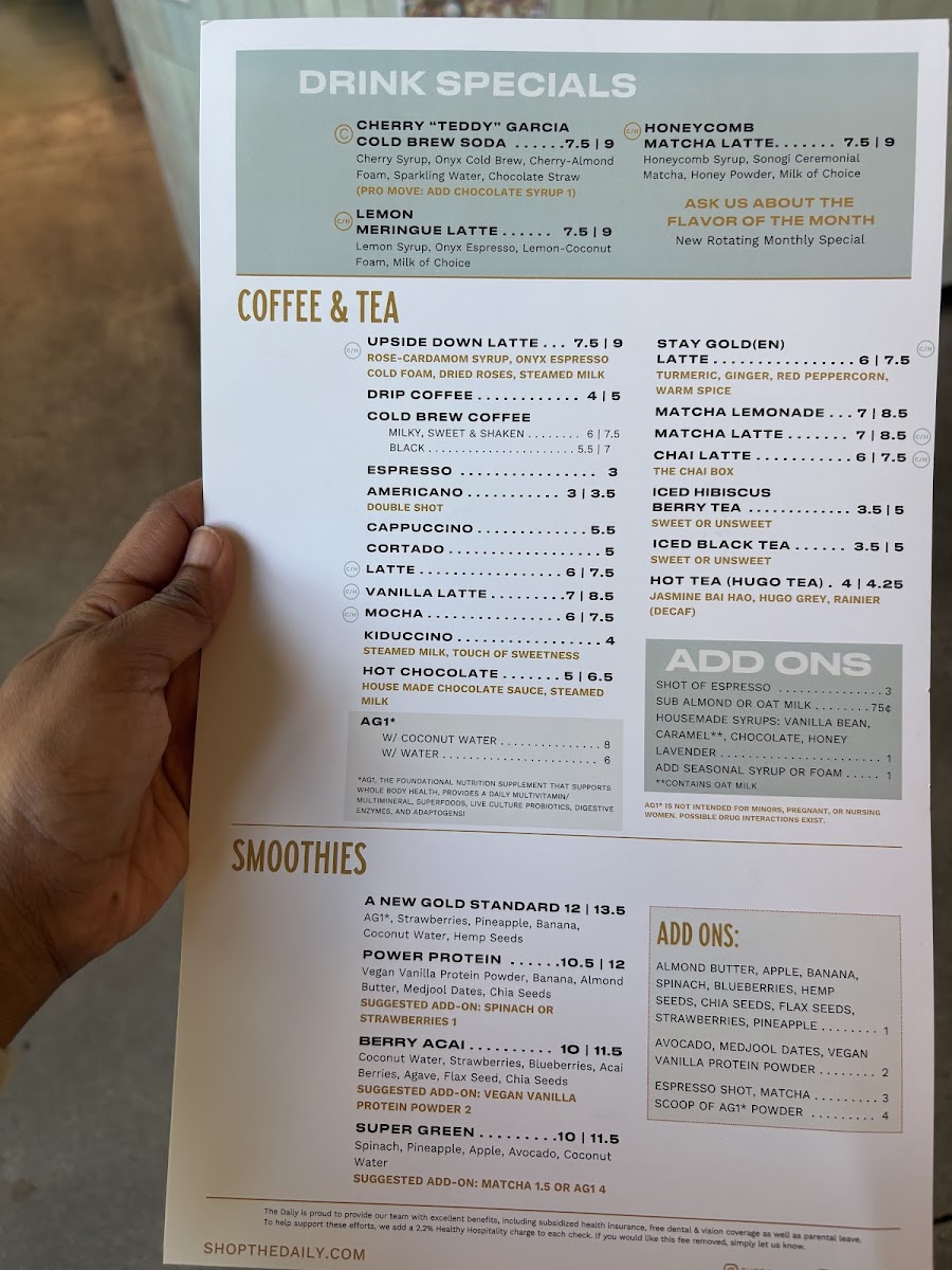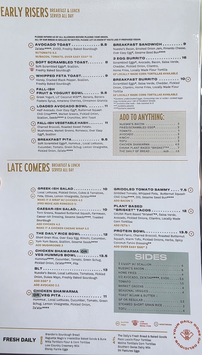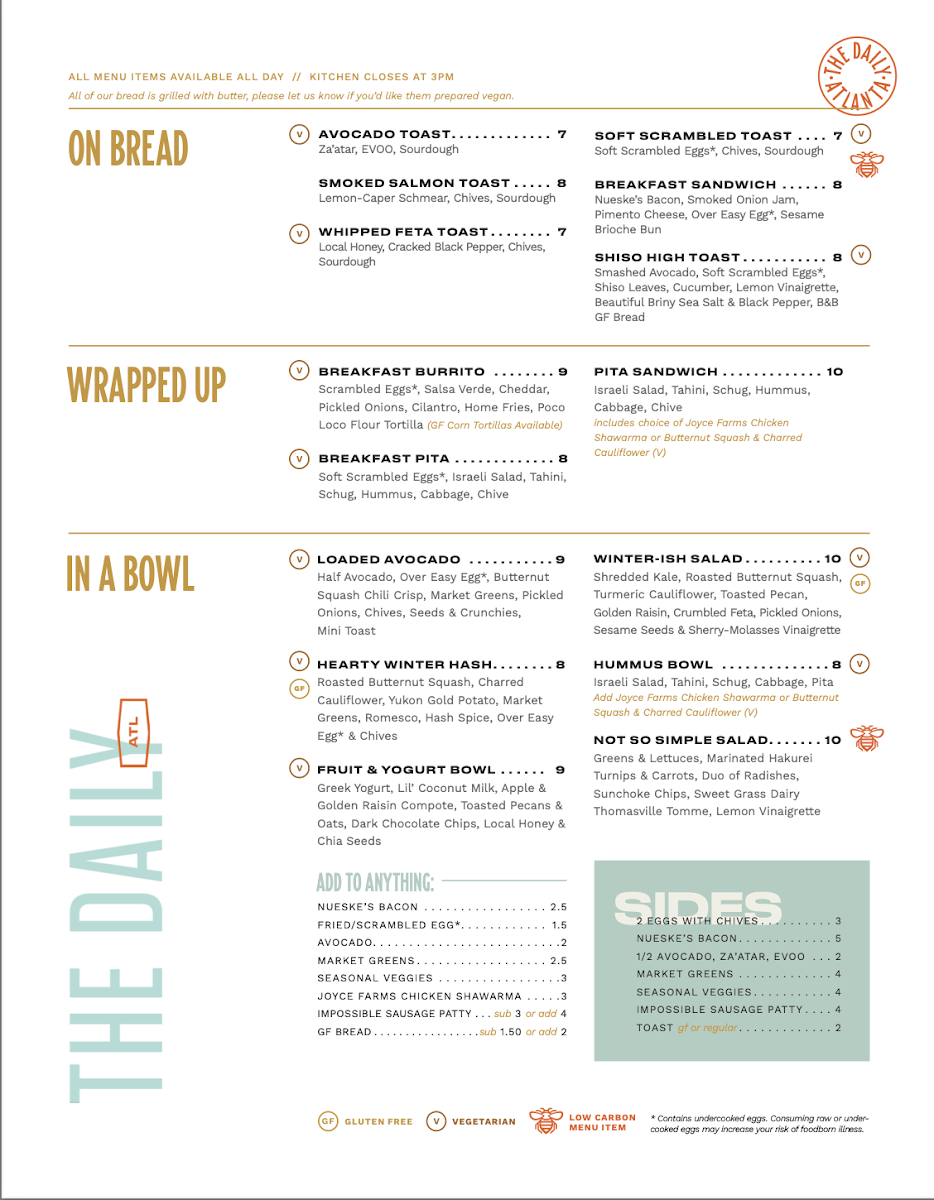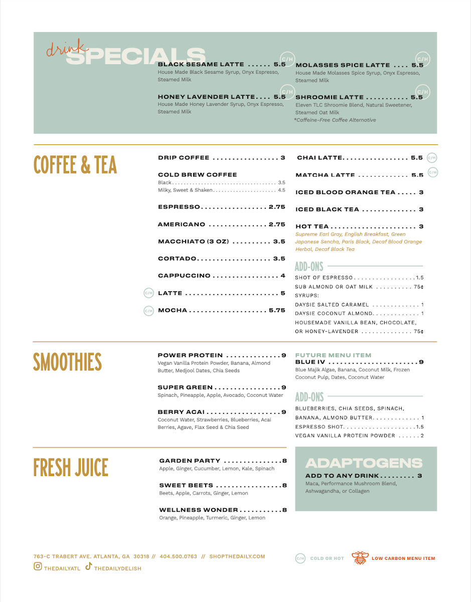 From a reviewer’s perspective, the menu at The Daily Cafe - Buckhead offers a well-rounded selection that blends specialty drinks, hearty breakfast items, fresh salads, and bakery goods. The drink program stands out with options like the Blistered Lemon Cold Brew (12 Oz), Iced Tea - Hibiscus Berry (16 Oz), Latte (12 Oz), Cafe Au Lait (12 Oz), and the unique Matcha-Tado (4 Oz), along with creative specials such as the Choco-Mint Matcha Latte (16 Oz), Brown Sugar Miso Latte (16 Oz), Gingersmack Latte (12 Oz), and Love Potion #8 (12 Oz). Food options are equally appealing, with satisfying choices like the 3 Egg Burrito, Salad (Greek-Ish), Salad (Winter-Ish), Hash, and the Griddled Tomato Sammy, while favorites such as the Bacon Breakfast Sandwich, Cold Brew (12 Oz), and Latte (16 Oz) remain popular for a reason. The smoothie selection, including Super Green (12 Oz), Berry Acai (16 Oz), and Power Protein (12 Oz), adds a healthy touch, and sides like Side - Hummus (2oz), Side - Whipped Feta (2oz), and Side - GF Toast W/ Jam & Butter complement meals nicely. To finish, baked goods such as the Apple Pie Sandwich Cookie, Biscuit (Buttermilk), and GF Bread (Full Loaf) round out a menu that feels thoughtful, varied, and suitable for both quick coffee stops and relaxed brunch visits.